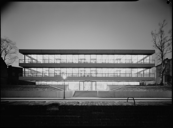 Der visionäre Stahlbetonskelettbau seiner Zeit besticht durch eine auskragende Rippendecke, die eine rundum vollverglaste Fassade ohne tragende Elemente ermöglicht – nach außen wie zum Innenhof.